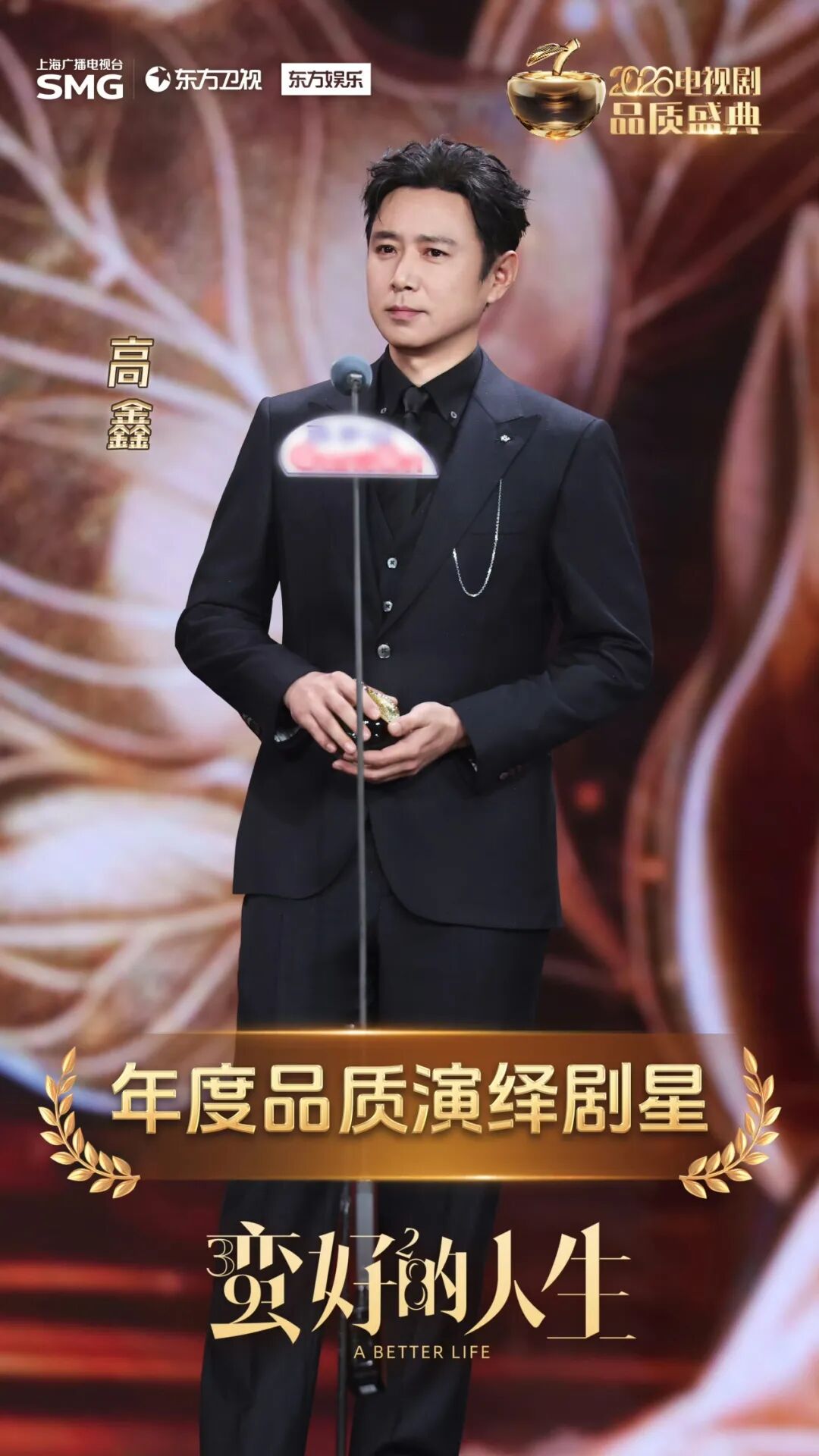 胡杏儿 饰 演 邱丽苏 高鑫演出了丁致远斯文面具下的窝囊怂,精准戳中观众情感共鸣,成为全剧最有生活味儿的喜感担当。领奖舞台上,他先是感慨这次合作很开心:“一帮优秀的演员在一块儿,是会碰撞出火花的”,但面对邱丽苏突如其来的“始乱终弃”,他转而向胡曼黎“清醒放话”:“感谢丁致远能在风华正茂的年代遇到了最美丽的你,也很荣幸你让丁致远在不惑之年认清了自己,这就是蛮好的人生!”脱口秀般的即兴幽默笑翻全场。 高 鑫 饰 演 丁致远 剧组大团建自然也少不了音乐的火热见证。《蛮好的人生》片头曲演唱者白举纲惊喜现身,再次唱起了火爆出圈的“Money歌”《胡曼黎》,充满特色嗓音带观众重温胡曼黎热血逆袭路,搭配魔性伴舞和经典手势,瞬间点燃全场。 从剧本打磨到镜头呈现,从演员演绎到制作水准,《蛮好的人生》以全链路品质坚守,实现口碑与热度双丰收,既展现了沪产剧的创作高度,也为现实题材都市剧树立了全新标杆,成为2025年度国剧品质的典范之作。 剧耀东方,以梦为马;品质同行,共赴新程!感谢2026电视剧品质盛典给予7项大奖的肯定,尚世影业将继续深耕上海母题精品创作,坚守品质,向新而行。