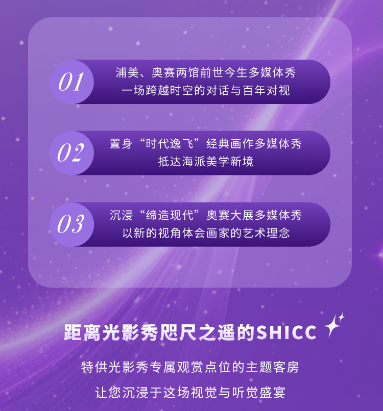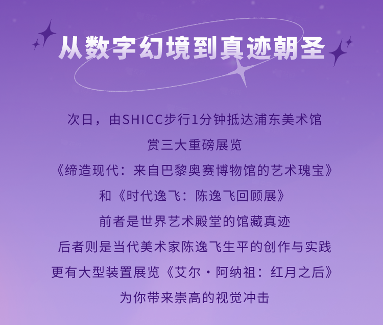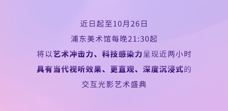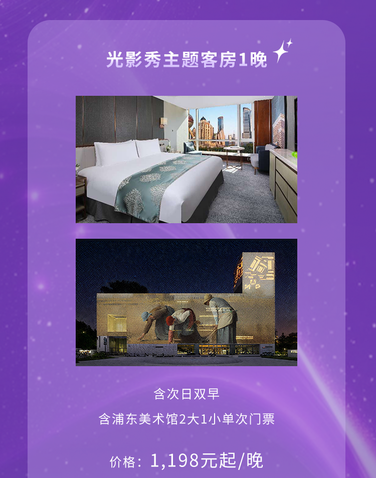 作为光影节主会场之一,浦东美术馆即日起至10月26日每晚呈现近两小时沉浸式光影大秀,就在仅咫尺之遥的国会中心光影主题客房中,您更可独享最佳观景位,轻松实现“足不出户,坐拥绚烂”!