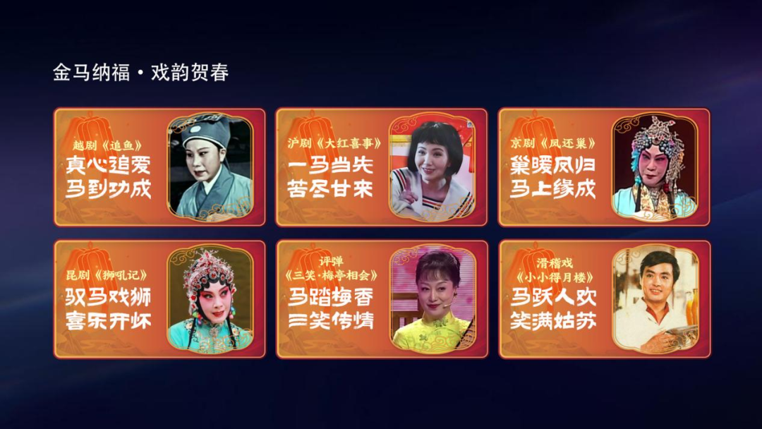 七彩戏剧专区“金马纳福·戏韵贺春”专题汇聚了越剧《追鱼》、京剧《凤还巢》、沪剧《大红喜事》、昆剧《狮吼记》、评弹《三笑·梅亭相会》、滑稽戏《小小得月楼》等经典喜剧。